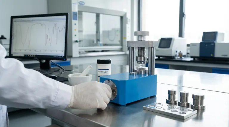 La spectroscopie infrarouge à transformée de Fourier (FTIR) identifie les liaisons chimiques en faisant passer la lumière infrarouge à travers un échantillon. Pour les échantillons solides, la méthode standard consiste à mélanger une petite quantité de l'échantillon avec de la poudre de bromure de potassium (KBr) et à la presser en une pastille mince et translucide.